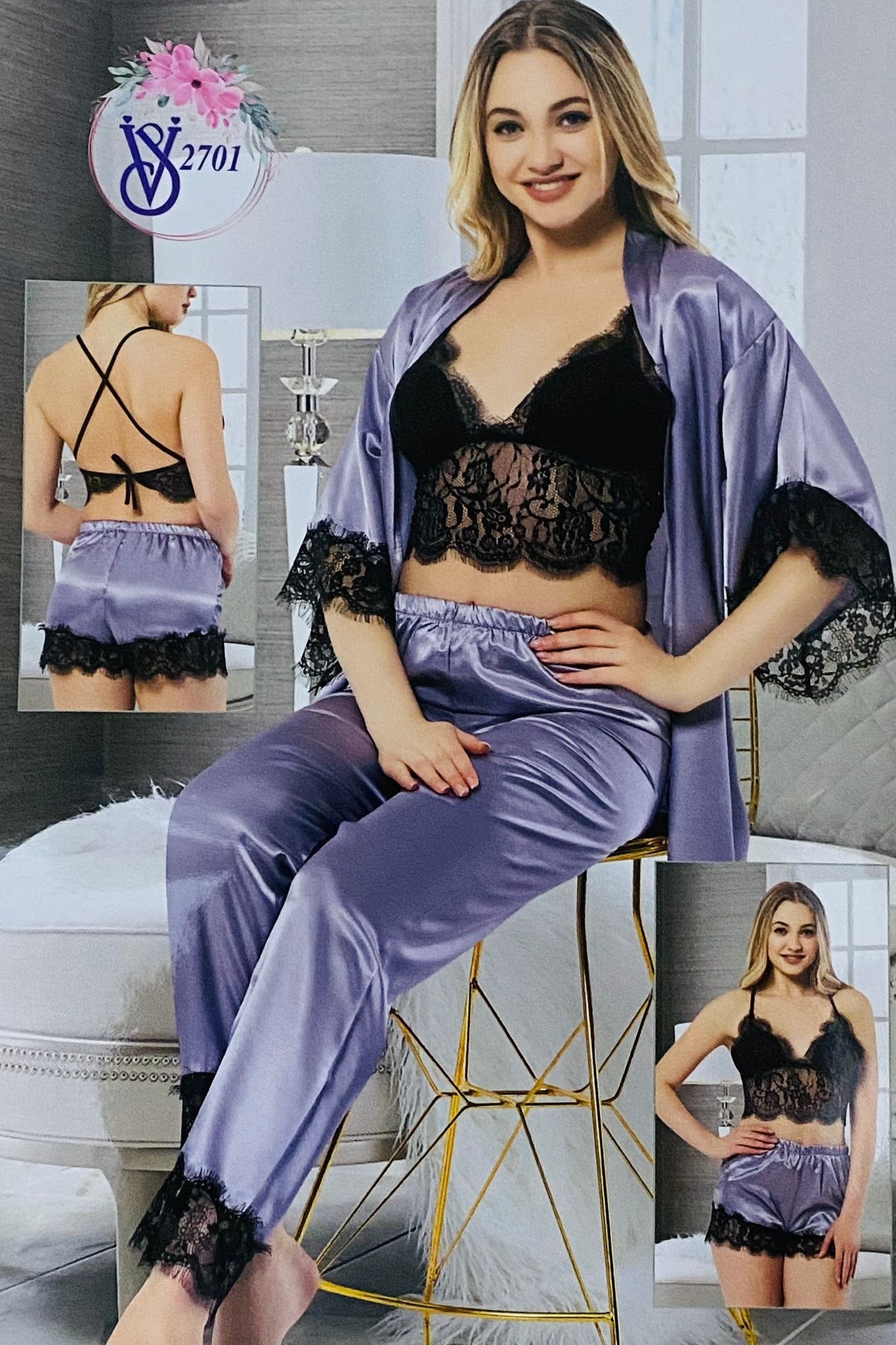 A matching burgundy satin robe with black lace trim on the sleeves, adding a touch of luxury and sophistication.